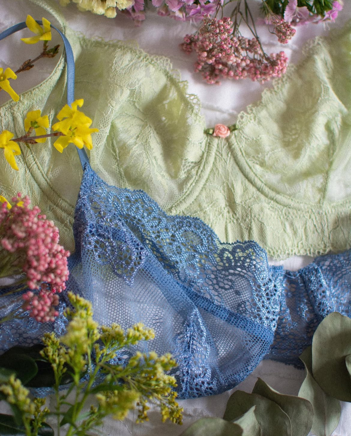 Clo Intimo “Fortuna” robe, $125, Bloom; “Tearose” underwire bra, $434, La Perla; The Little Bra Company “Ethel” panty, $32, Forty Winks; “Petit Macrame” underwire long-line bra, $584, La Perla; Hanky Panky bridal babydoll (with matching thong, not shown), $105 for the set, Rigby & Peller; Lonely “Bonnie” underwire bra, $99, Forty Winks; Hanky Panky front-tie bralette, $46, Forty Winks; Christine shorts (with matching cami, not shown), $250 for the set, Bloom; additional props from Les Fleurs and Anthropologie.
