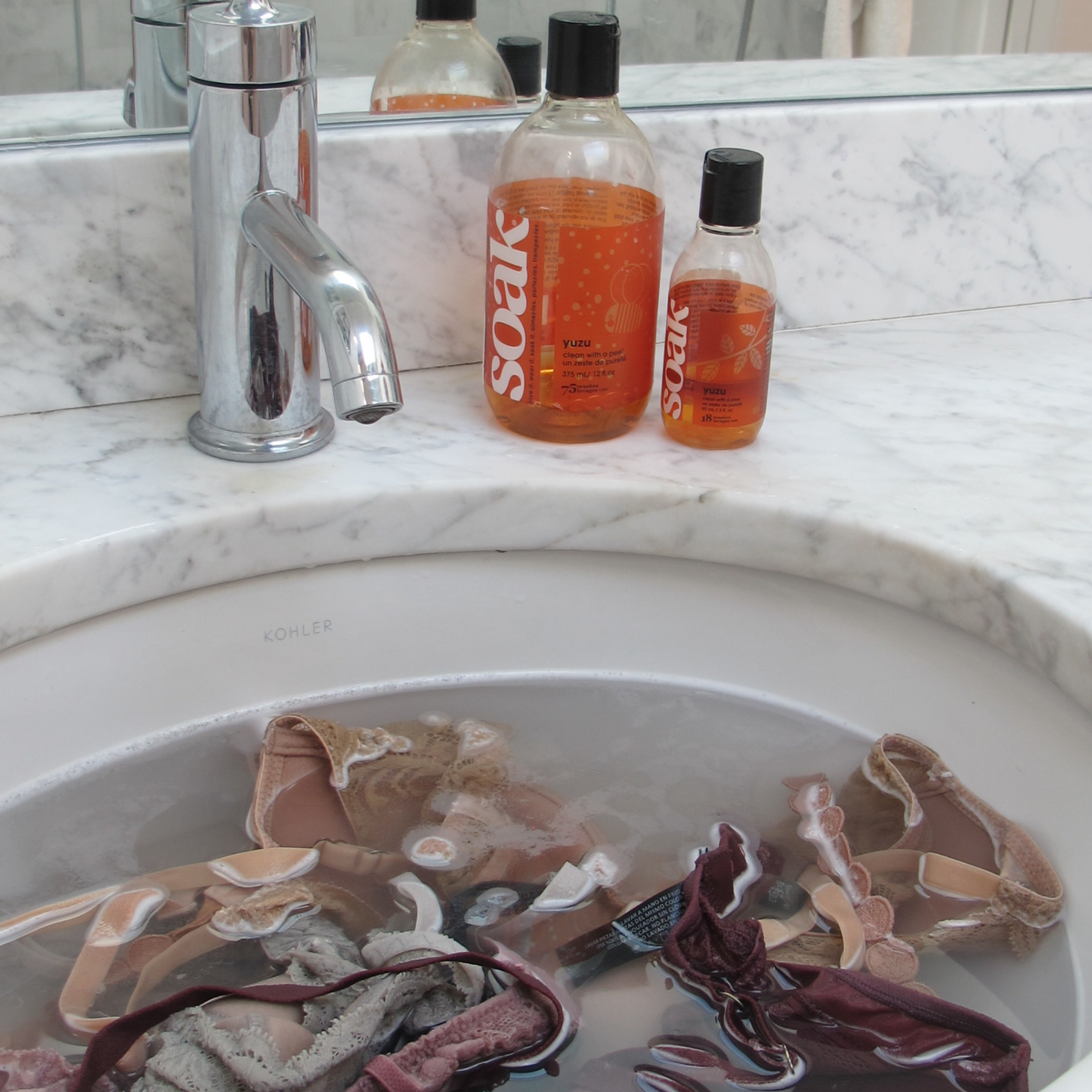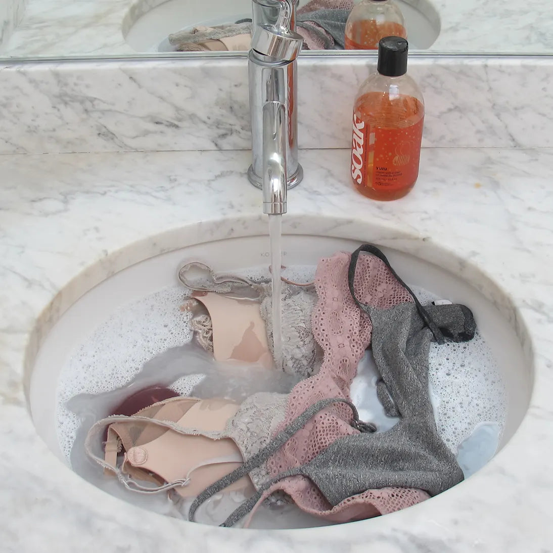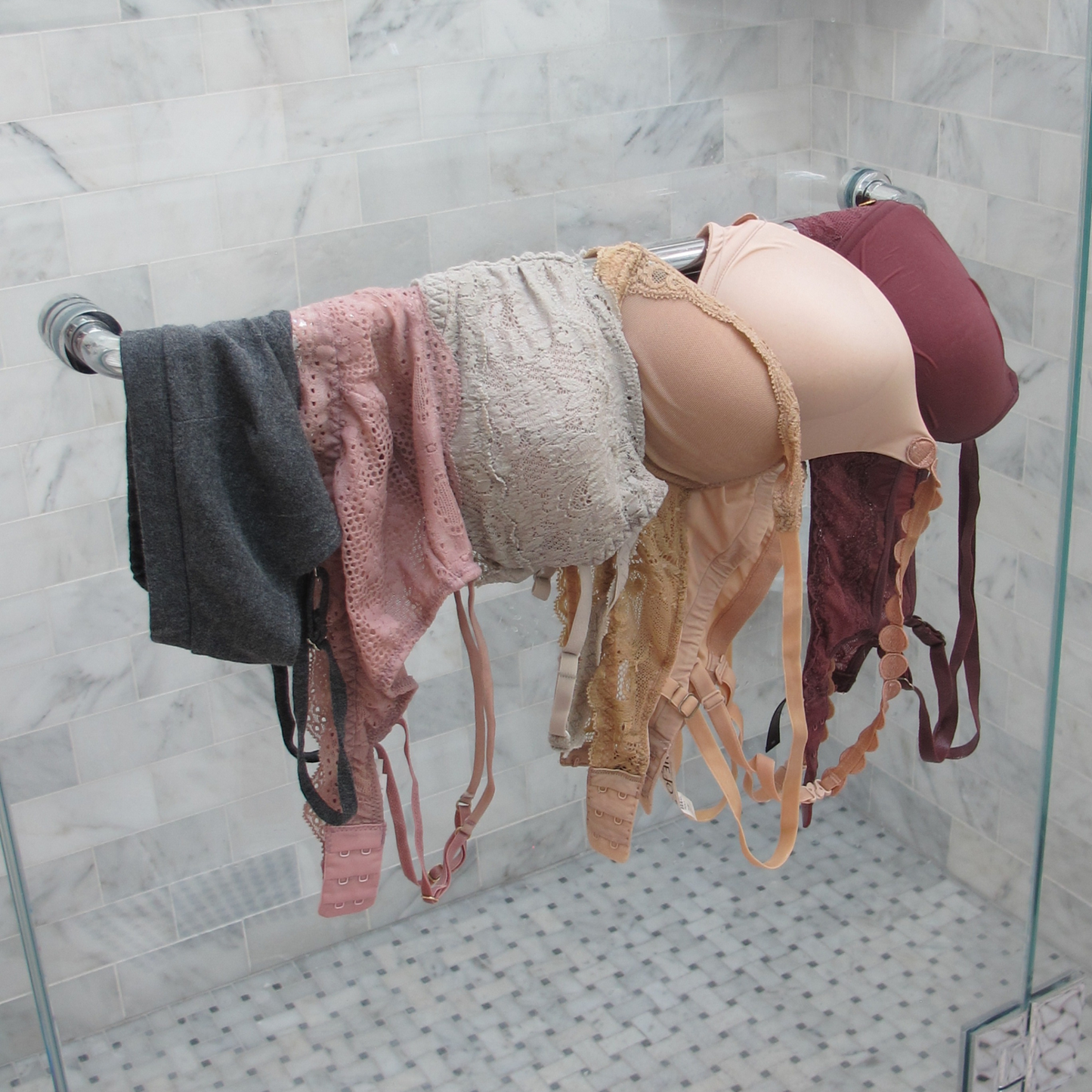 Don’t have time to do a full basin of bras and need to quickly wash a couple? Take your bras in the shower with you and use the lingerie wash there. Then lay flat over the ledge or lay flat to dry.