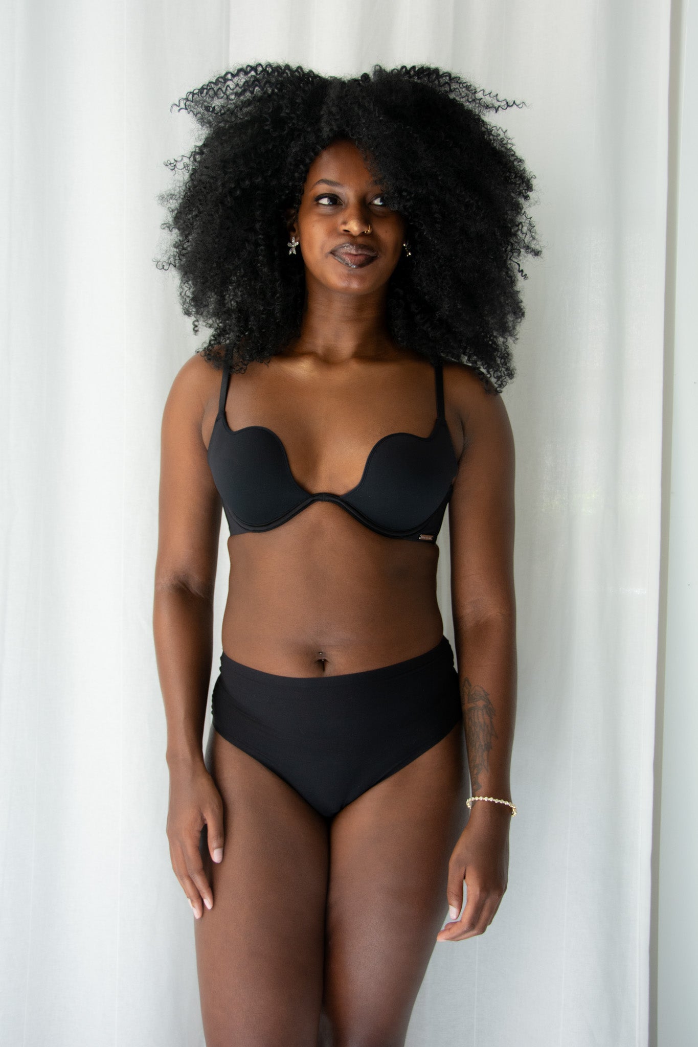 This solutions-based bra from Fleur du Mal features a molded cup with a deep U-plunge front to accommodate deep v necklines while offering a noticeable push up.