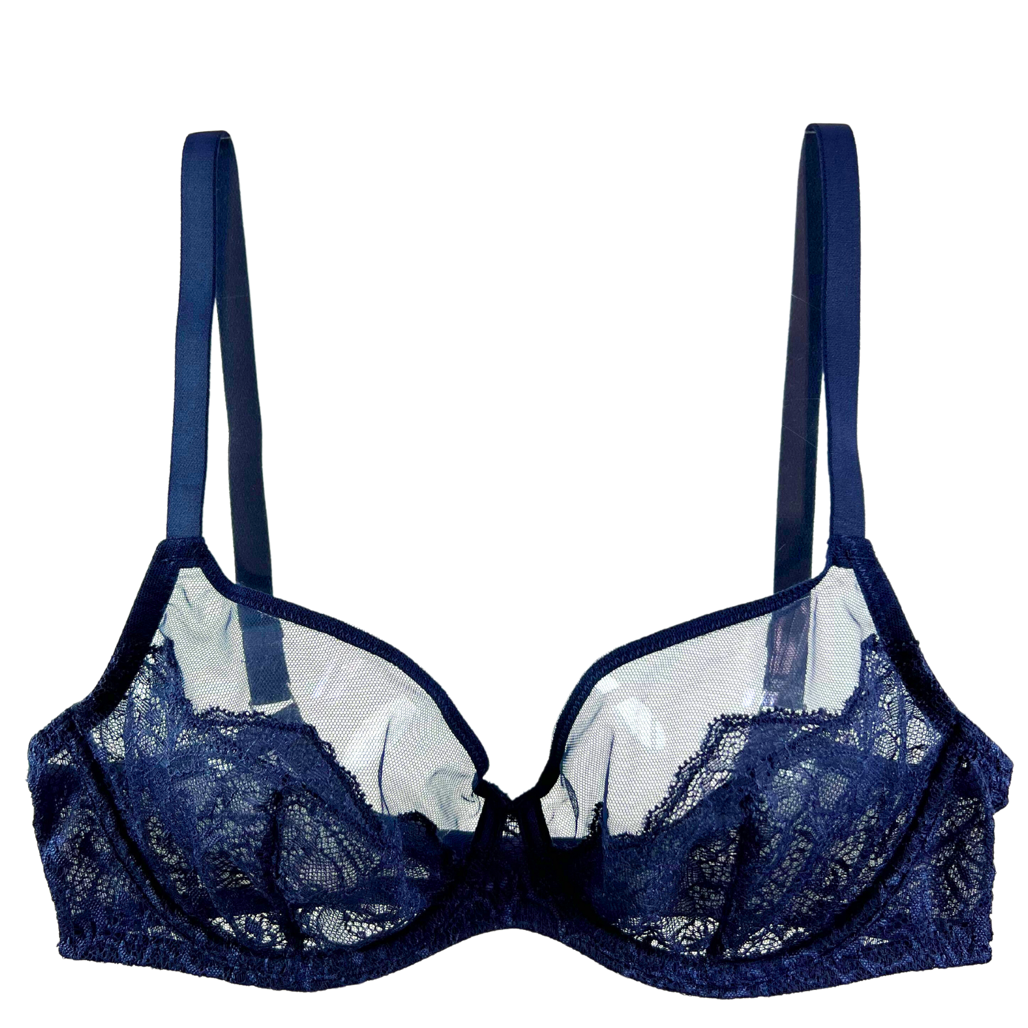 Cups: Run slightly small. Lace and mesh cups are unlined. Lace portion is opaque while mesh upper is see-through. Medium center gore for lower profile look.