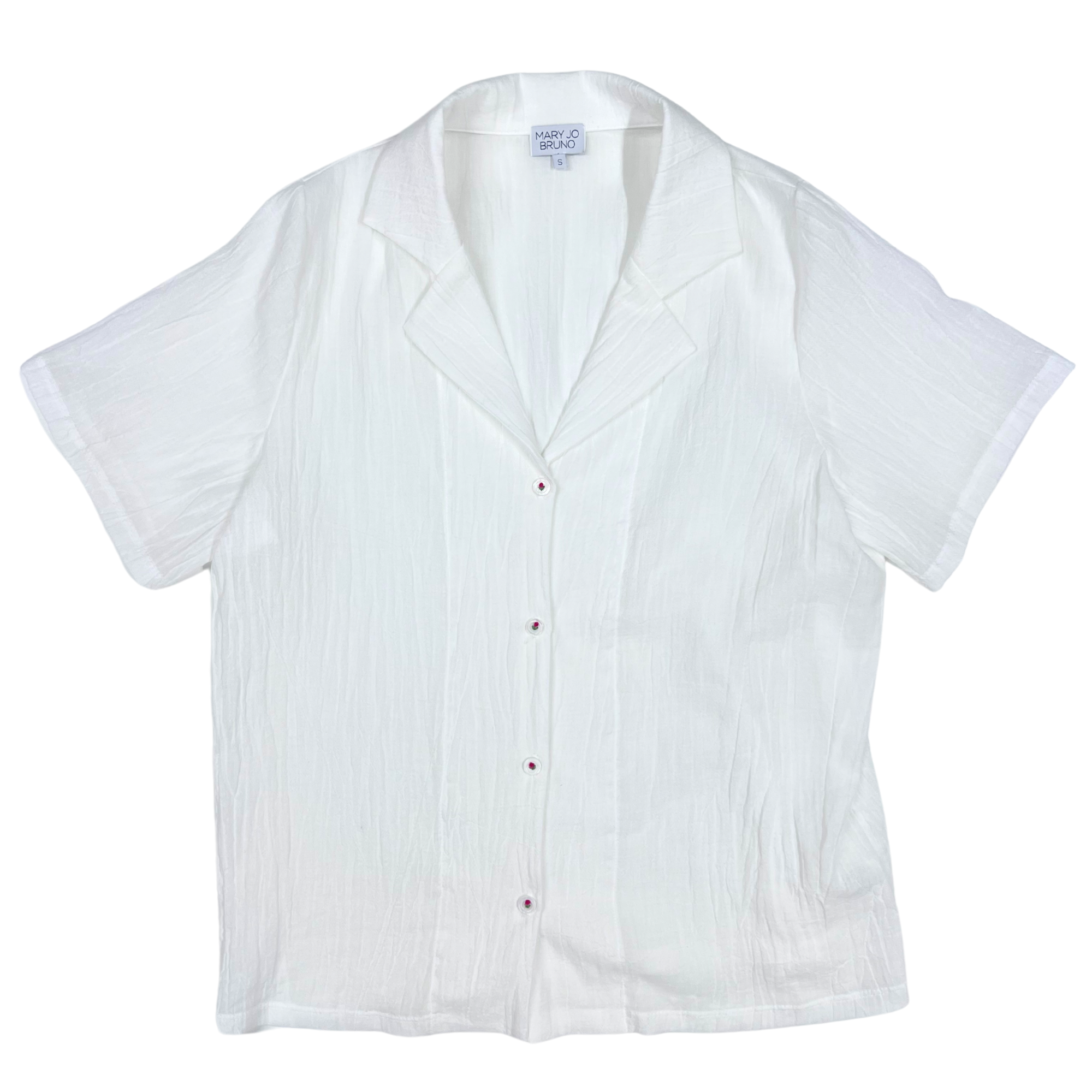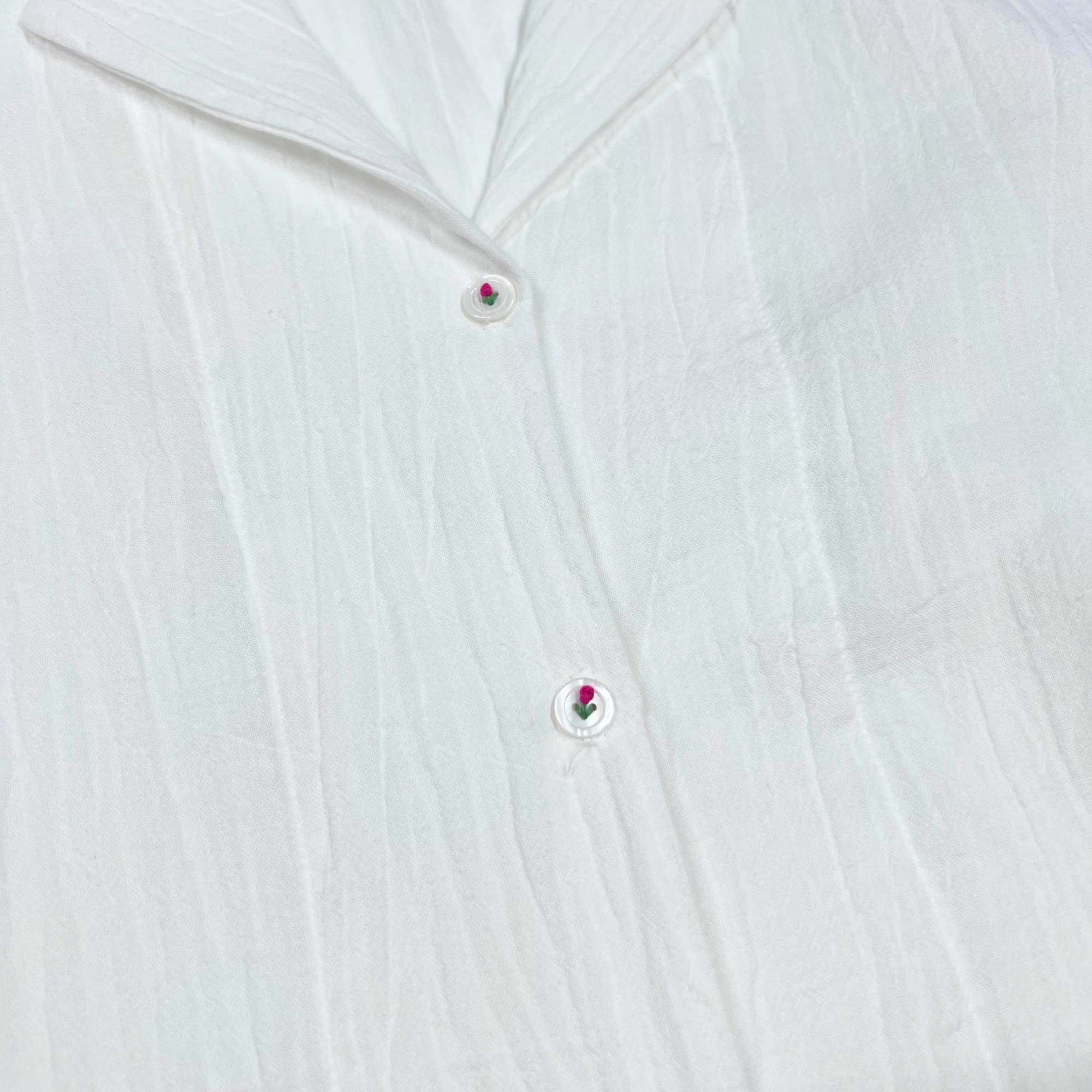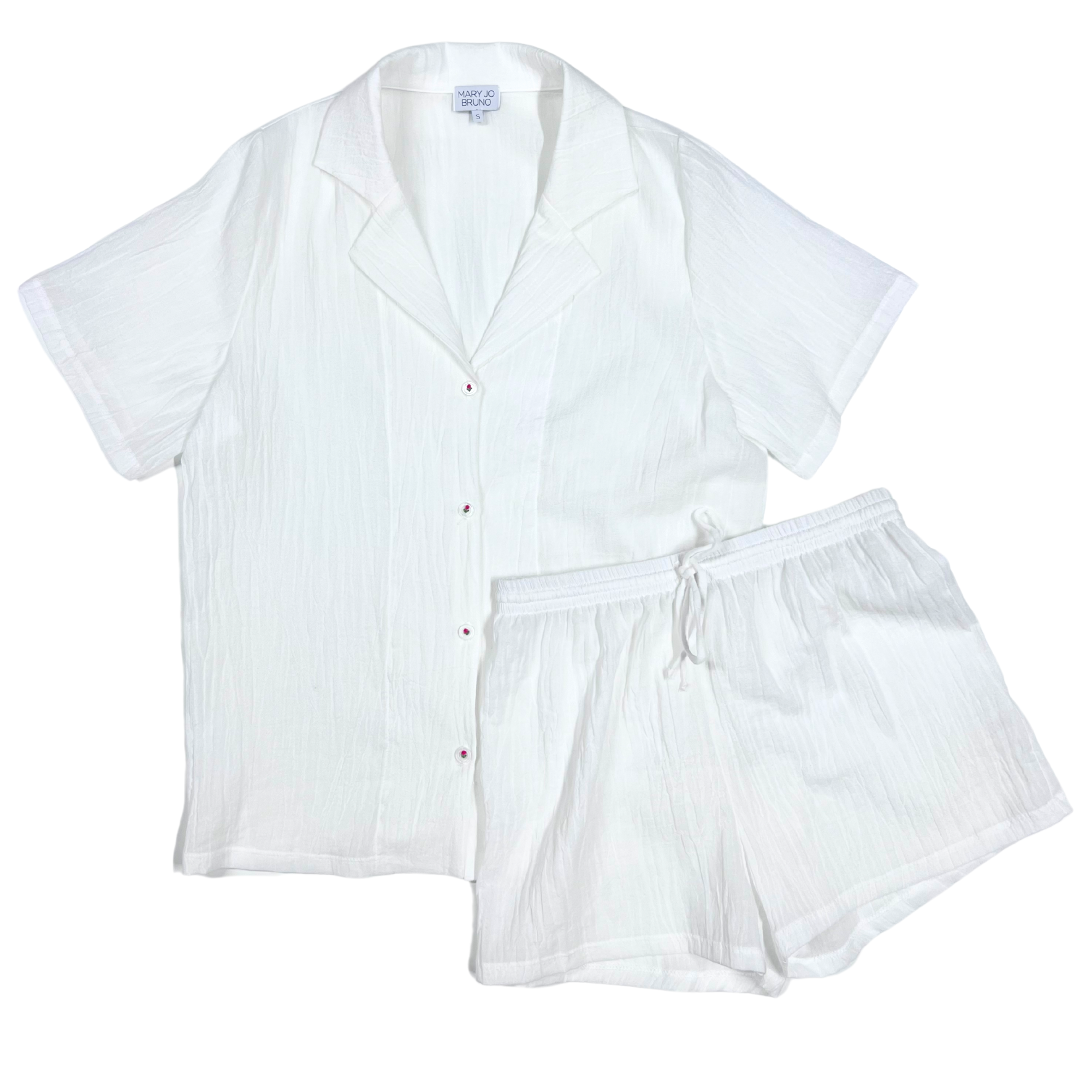 The Voile PJ set by Mary Jo Bruno is made of soft, smooth voile cotton and features sweet rosette detailing on each button.