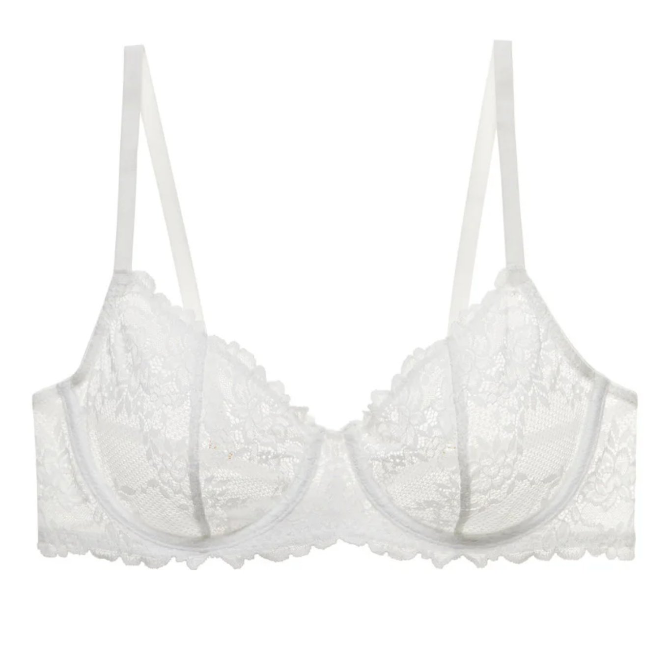 Cups: See-through, lace cups. Offers great coverage that gives support without being overwhelming Unlined cups, no foam.