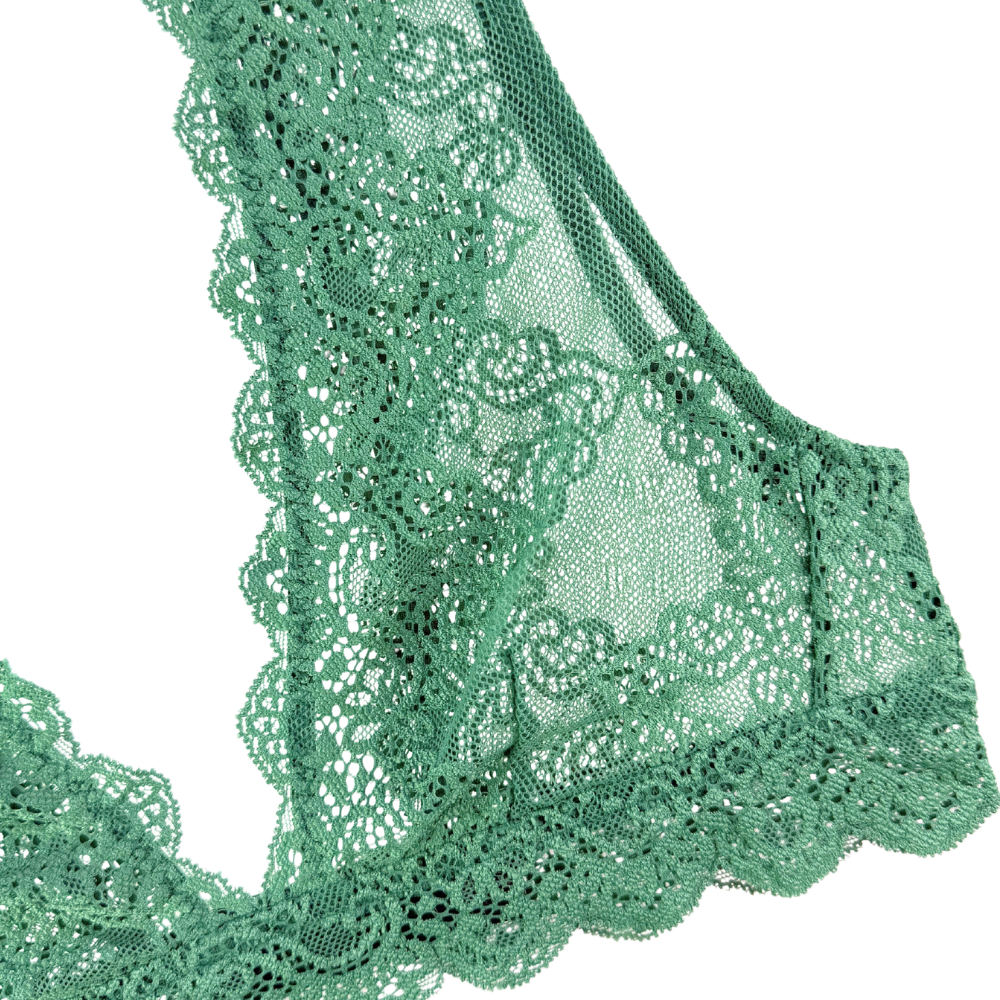 Cups: Wireless cups. Unlined, all lace. Intentionally full coverage. Low, plunge center gore.