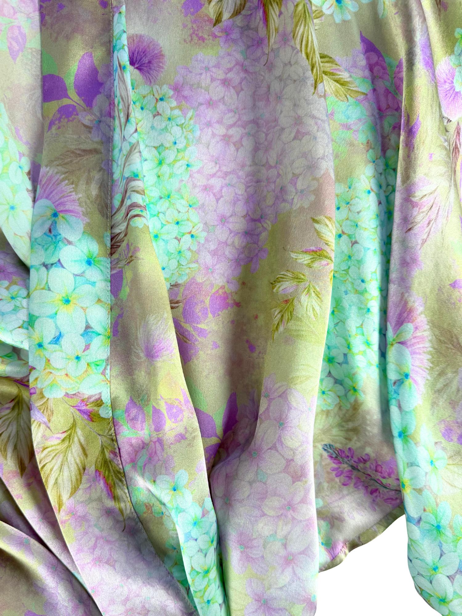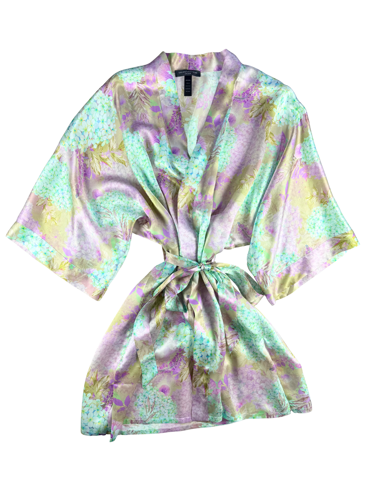 The kimono-style robe by Samantha Chang features light silk charmeuse and an above-the-knee length in timeless, beautiful prints.